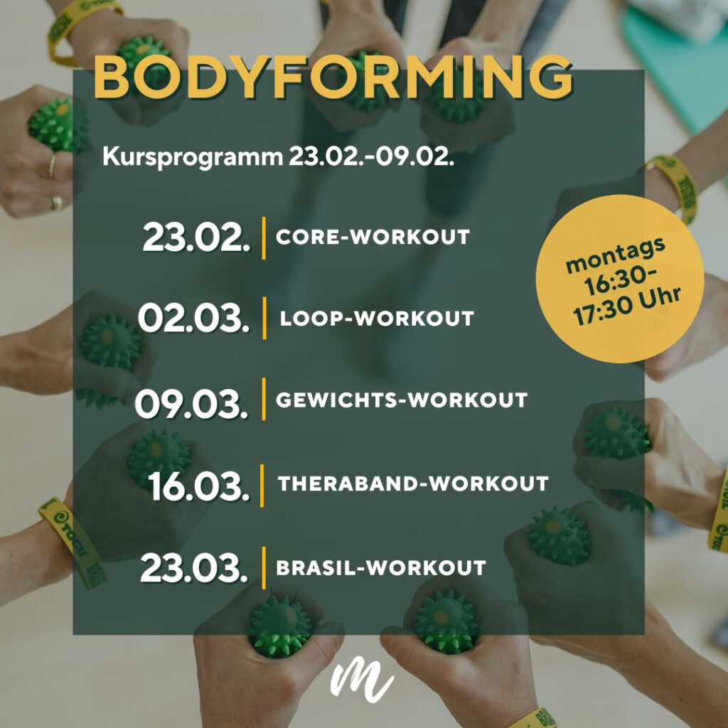 Der Bodyforming Kurs macht großen Spaß und Muskelkater. Susanne bietet immer Alternativen an, sodass man je nach Fitnesslevel variieren kann. Auch die Babys sind im Kurs willkommen und haben dank Musik und guter Stimmung ihren Spaß. Für mich war der Kurs perfekt, um nach der Rückbildung weiter in Form zu kommen. Man spürt nach jeder Einheit in Bauch, Beinen und Po, was man getan hat.