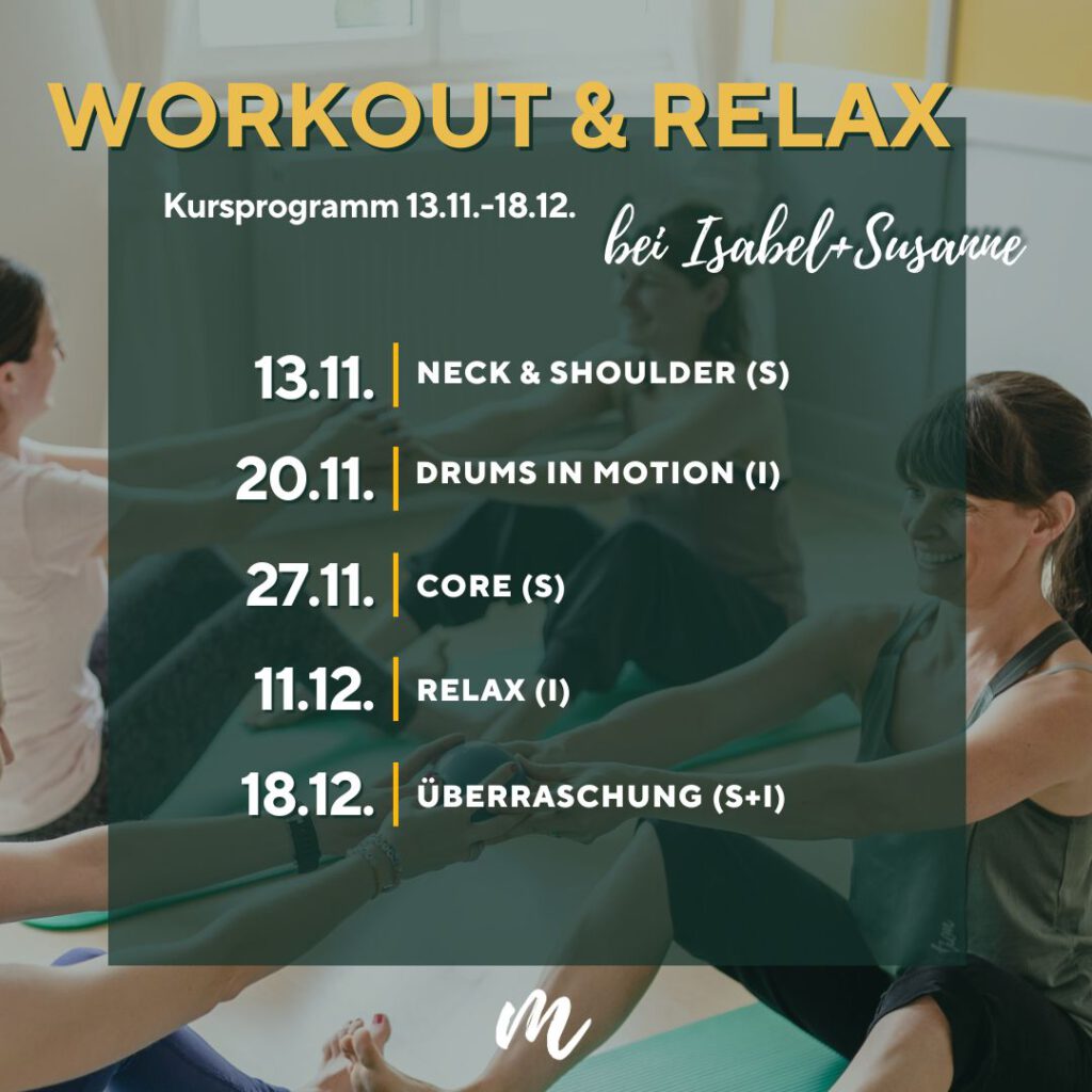 Der Workout&Relax-Kurs beinhaltet eine effektive Kombination aus Kräftigungs-, Koordinations-, Ausdauer- und Beweglichkeitsübungen und ist damit ein perfekter Ausgleich für deinen Alltag. Jede Woche erwartet dich ein anderer Schwerpunkt u.a. aus den Bereichen Kraft, Koordination, Entspannung, Rhythmus, Mobilisation, Faszientraining, Intervalltraining.